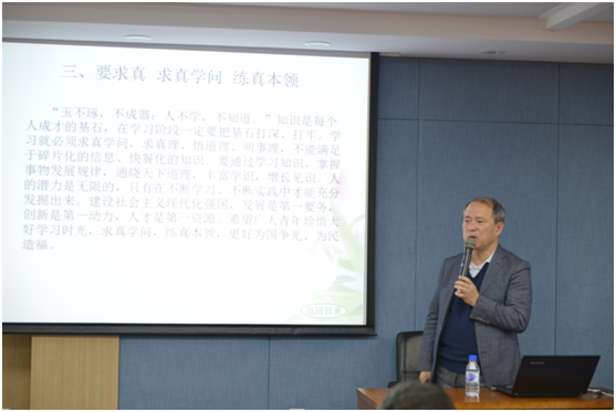 曲建武教授以“爱是教育的灵魂”为主题,以习近平总书记对青年提出的“爱国、励志、求真、力行”四点殷切希望为切入点,结合自己做大学生思想政治工作的实践和思考,作了一场鲜活生动、情感真挚、内容深刻的报告。曲老师讲述了自己做辅导员及从事思想政治教育工作的心得,分享了他与学生之间一个又一个质朴而生动的故事。在三尺讲台,他慷慨激昂,面对学生,他睿智真诚,是一名可以说心里话的“爸爸老师”。他“谆谆如父语,殷殷似友亲”,让人看到了“师者”的力量。他在教书育人的道路上默默跋涉,把一份矢志不渝的坚守写在了无声大爱之中。曲老师叮嘱青年要珍惜美好时光,加强理论学习,提升实践能力,将个人的发展与国家的发展紧密结合起来,在建功新时代的生动实践中实现人生价值。