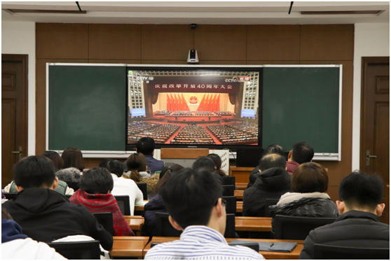 教工党支部书记及学生代表在东荣大厦B区117会议室进行了集体观看与学习,共同关注这一重要的历史时刻。习近平总书记在改革开放40周年大会上的讲话在参会师生中产生强烈的反响。