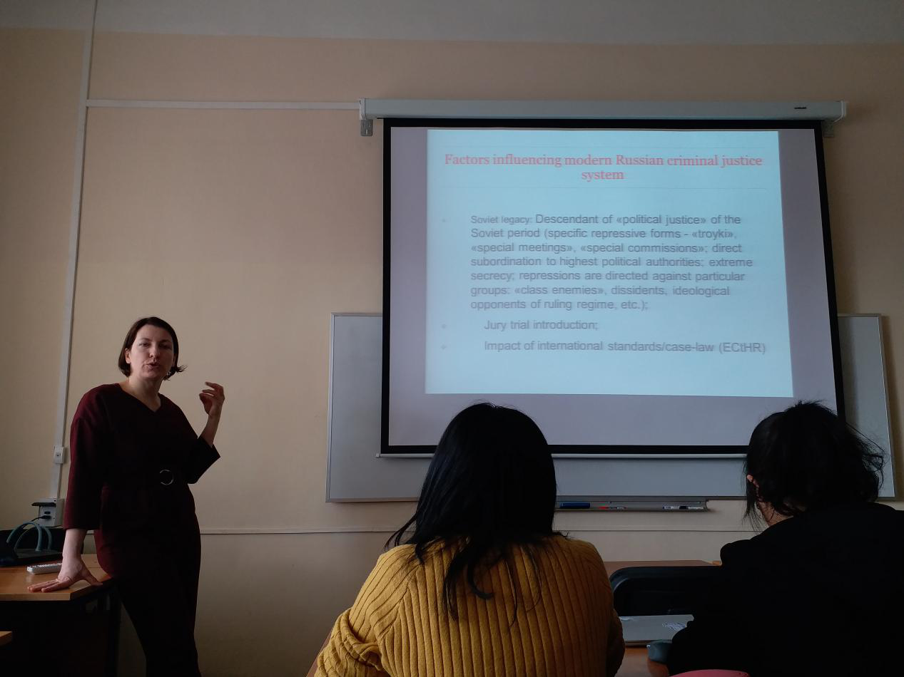 师生在俄罗斯宪法课程中,对俄罗斯宪法的历史变革、文本规范、文化基础、司法实践、政法关系进行了学习和了解,特别就十九大报告中提出的“推进合宪性审查”与俄罗斯宪法审查制度的内容与俄方授课教师进行了探讨。在俄罗斯商法课程中,赴俄访学学生学习了俄罗斯商法基础理论和商事基本规范,对俄罗斯商法理论有了一定了解。在研究方法上,赴俄访学师生在授课中,注意到了俄罗斯法学在法教义学研究方法上的高度发展,俄罗斯法学教学有着强烈的规范文本意识,这与我国法学教育发展的方向竞合,获得较大的收获和启发。同时,在法学教育上,还就俄罗斯法学教育课程体系安排与设计等问题与俄方学院进行探讨与交流。