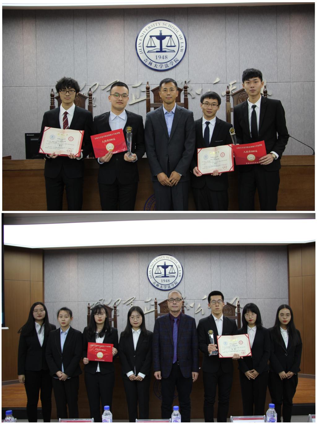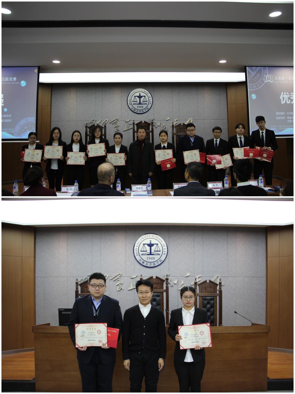 党委副书记徐杰老师向现场嘉宾与同学们宣布了本场竞赛的获奖队伍和队员后进入颁奖典礼。王立国老师为获得本届模拟法庭竞赛优秀队员奖的李璐、单佳琦、徐晖、刘莹、高艺琪、邵学颖、刘泽宇、许超、王乙渊和陈一鸣等10位同学颁奖;高宇老师为获得最佳风采奖的李璐同学和刘泽宇同学颁奖。