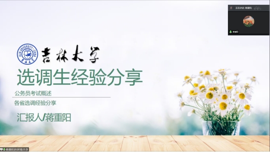 第二位作主题经验分享的是考入广东省纪委的蒋重阳同学,为同学们作了一场细致的公务员选调考试的经验分享,她一开始对中央选调与省选调考试作了说明与比较,然后就省选调考试作了更为全面的介绍,对公务员考试笔试部分的行测与申论题型进行了详细分析,同时对面试的注意事项作了细致讲解,最后提醒同学们注意,要及时获取信息并提前做好准备。