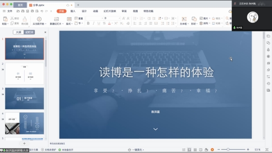 最后由陈洪磊同学就其读博经历作经验分享,他告诉大家读博一定是一个痛苦与幸福并存的过程,主要从两个角度进行介绍,一方面鼓励大家从成本收益角度分析自己是否有读博的兴趣,另一方面要考虑读博的付出与毕业标准,继而判断自身是否具备读博的能力,在做好决定之后就需要全身心投入、坚持目标。最后,陈洪磊同学就参会同学提出的论文选题、参考文献等问题作出了细致解答。