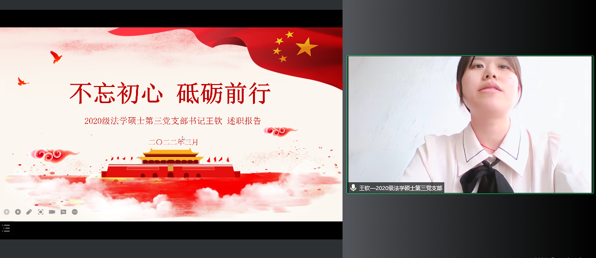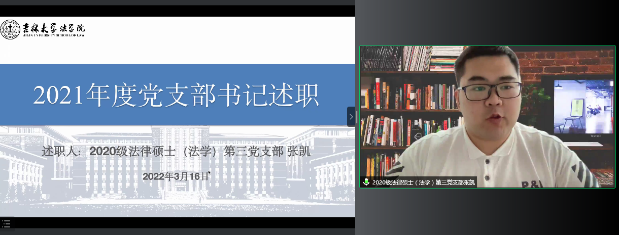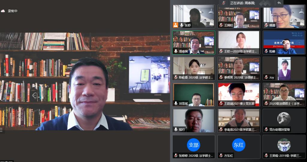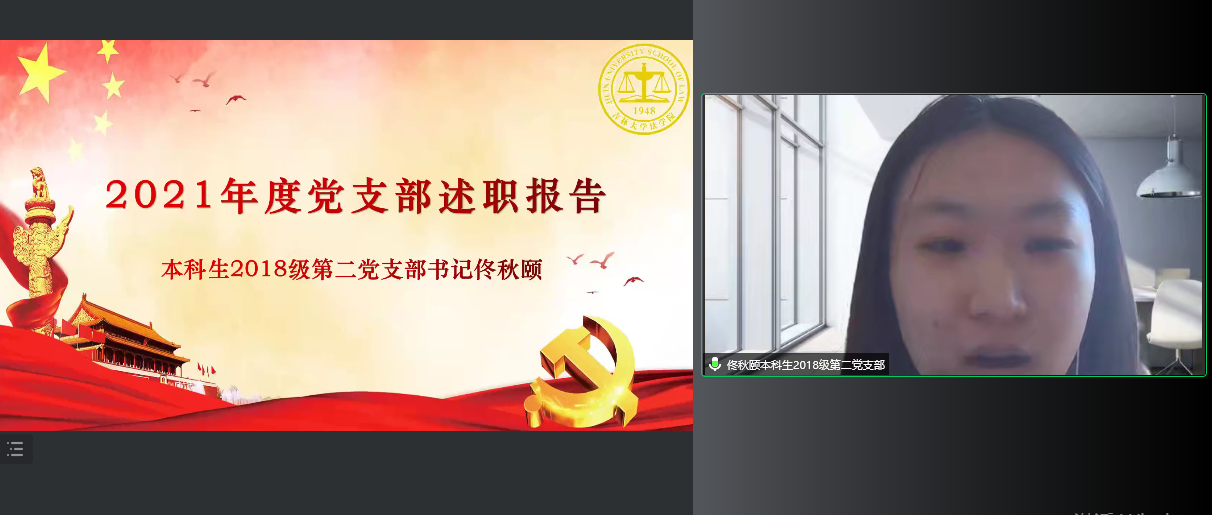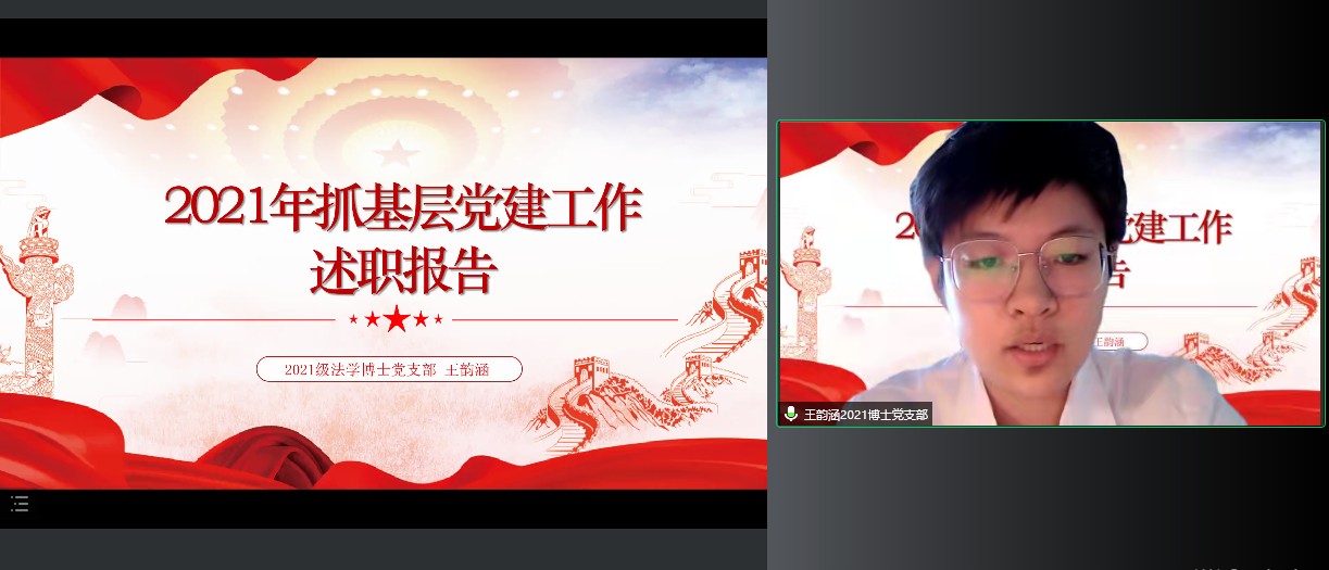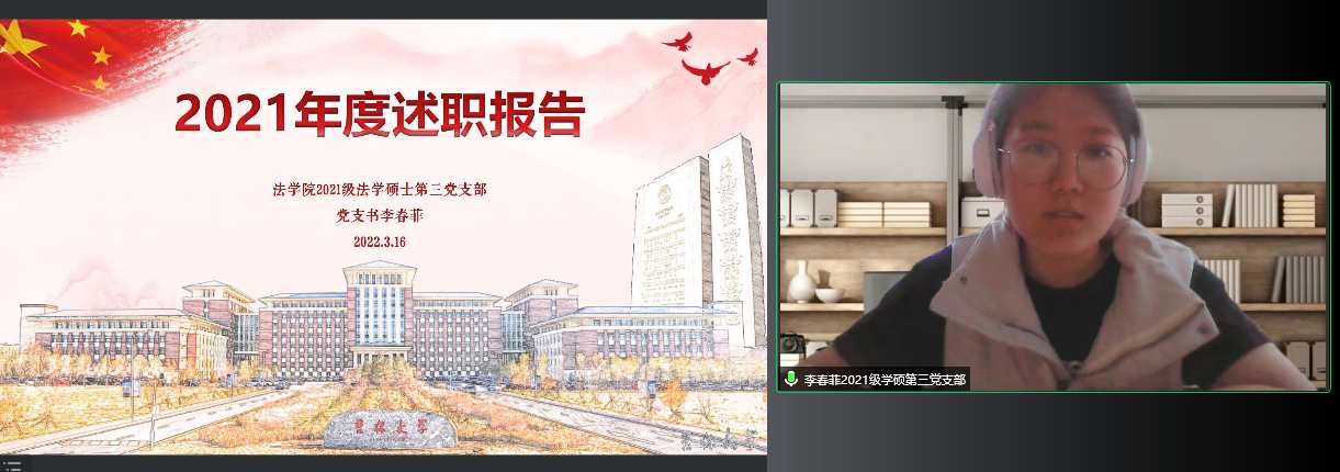 党委书记周春国在总结点评中对各教工和学生党支部在2021年度党建工作中取得的成绩给予充分肯定,并对进一步做好基层党支部工作提出四点意见:首先,党支部工作的根本是实事求是,不能搞形式主义。要通过党支部“三会一课”的载体将之与教学科研、人才培养、学生成长等情况结合起来,与新时代e支部的建设结合起来,只有让每一位老师和同学在参加支部活动中有所收获才能增强党支部建设的生命力。第二,党支部工作的目标是提升党员的先进性。党支部的工作是为了不断巩固和扩大党执政的群众基础,因此工作中一定要抓住工作重点,比如当下全民抗疫,教师的工作重点应该是做好线上教学工作,关注关心学生生活;学生的工作重点应该是积极参与志愿服务,专注于提升学业成绩,严格遵守学校防疫规定。第三,党支部工作的水平取决于党支部书记的投入和付出。党支部书记是党最基层、最重要的先锋战士,如果党支部书记的政治站位不高,规划能力不足,付出程度不够,那么党员的工作状态无法保证,再好的规划与蓝图都难以落实,每一个党支部书记都应该是一面旗帜,要极其重视自己的岗位职责。第四,党支部工作的创新在于要抓住机遇。在当下抗疫的大背景中,党支部工作要能够与抗疫结合在一起,为抗疫献策,为抗疫助力,抓住抗疫,就抓住了凝聚所有党员的机会。周春国强调,学院每一位老师和每一位同学都是打赢吉大抗疫保卫战的中坚力量,感谢大家在抗疫工作中的付出,叮嘱大家在做好自我防护的同时肩负起党员干部的责任,共同努力为吉大法学今后的抗疫工作贡献力量。