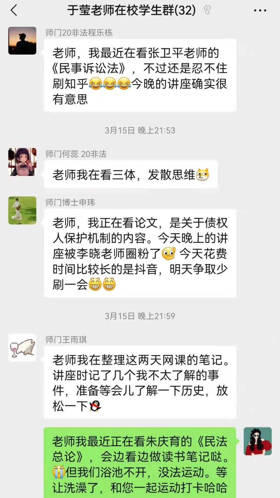 3月26日,于莹老师召开了本学期第二次师门会,老师依旧先关心了我们的生活,了解到大家的生活都规律起来之后,给我们分享了自己做志愿者的经历。同学们也都分享了自己近期的生活:王若楠同学分享了最近读书写论文的进度;何蕊同学分享了在天津律所实习的经历;冀嘉晨同学分享了在寝室备考雅思和健身的日常;胡晓天同学在为参加学院举办的手游比赛努力练习;潘栋林同学分享了室友在练习参加学院现场演唱会的歌曲;王雨琪同学分享了室友们日常一起看电影等休闲活动。虽然被封在寝室,但是每个人的生活都多姿多彩,利用这段难得可以完全自由支配的时间,做到了自我成长。