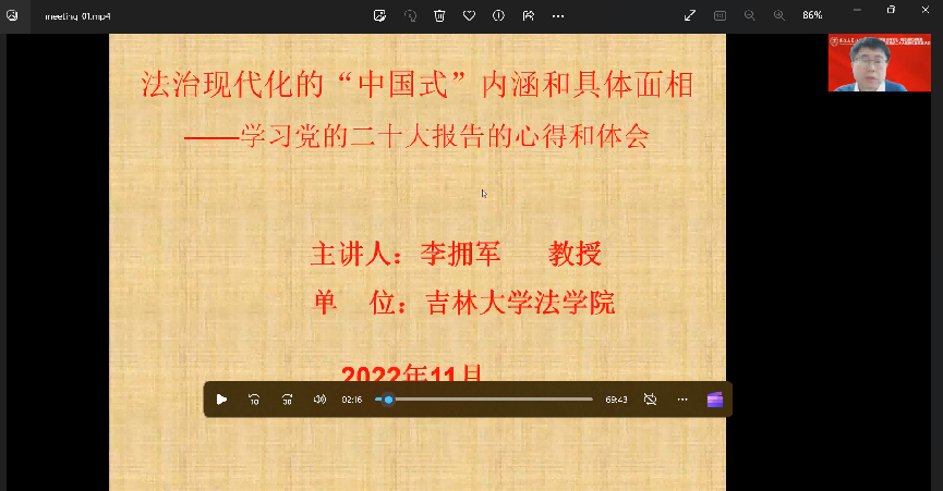 李拥军教授以《法治现代化的“中国式”内涵和具体面相》为题,分享了他个人对党的二十大报告学习的心得和体会。李拥军教授指出,中国式法治现代化是中国式现代化的重要组成部分,是中国式现代化在法治领域中的具体体现,是坚持中国特色社会主义法治道路的集中表达,是从我国革命、建设、改革的实践中探索出来的适合自己国情的法治现代化道路。文化传统、中国社会和法律发展的特殊实践、特殊的具体国情型塑着中国法治的特殊性和法治现代化的“中国式”内涵。