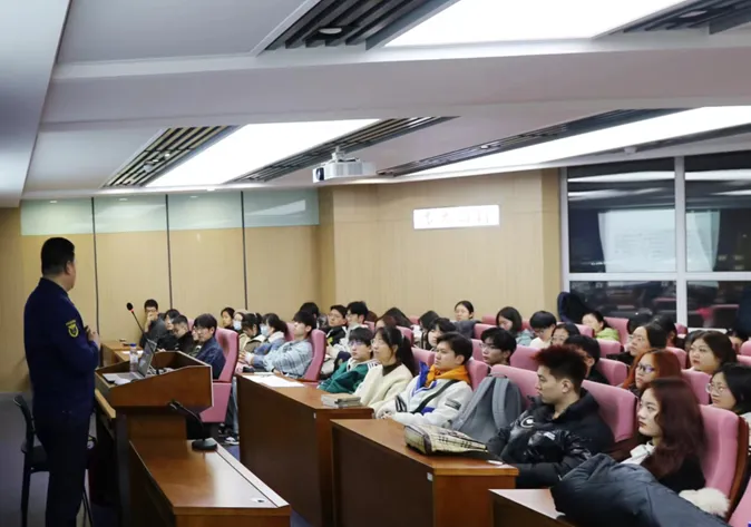 讲座中,董立明老师首先从近期全国部分地区发生的重大火灾事故入手,向同学们强调了开展校园消防安全工作的现实性与紧迫性;之后,董立明老师结合目前校园消防安全工作的实际情况,指出校保卫处将注重提升“检查消除火灾隐患、组织扑救初期火灾、组织人员疏散逃生以及消防宣传教育培训”四个能力,着重强化消防管理、按时进行消防检查,为校园消防安全、学生人身安全提供坚实保障;最后,董立明老师向同学们展示了灭火器的正确使用方法,并详细讲解了生活中降低火灾发生隐患的举措、火灾发生时的应急处理措施以及自救互救方法。