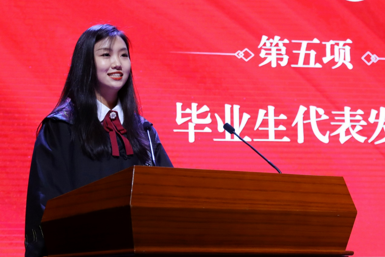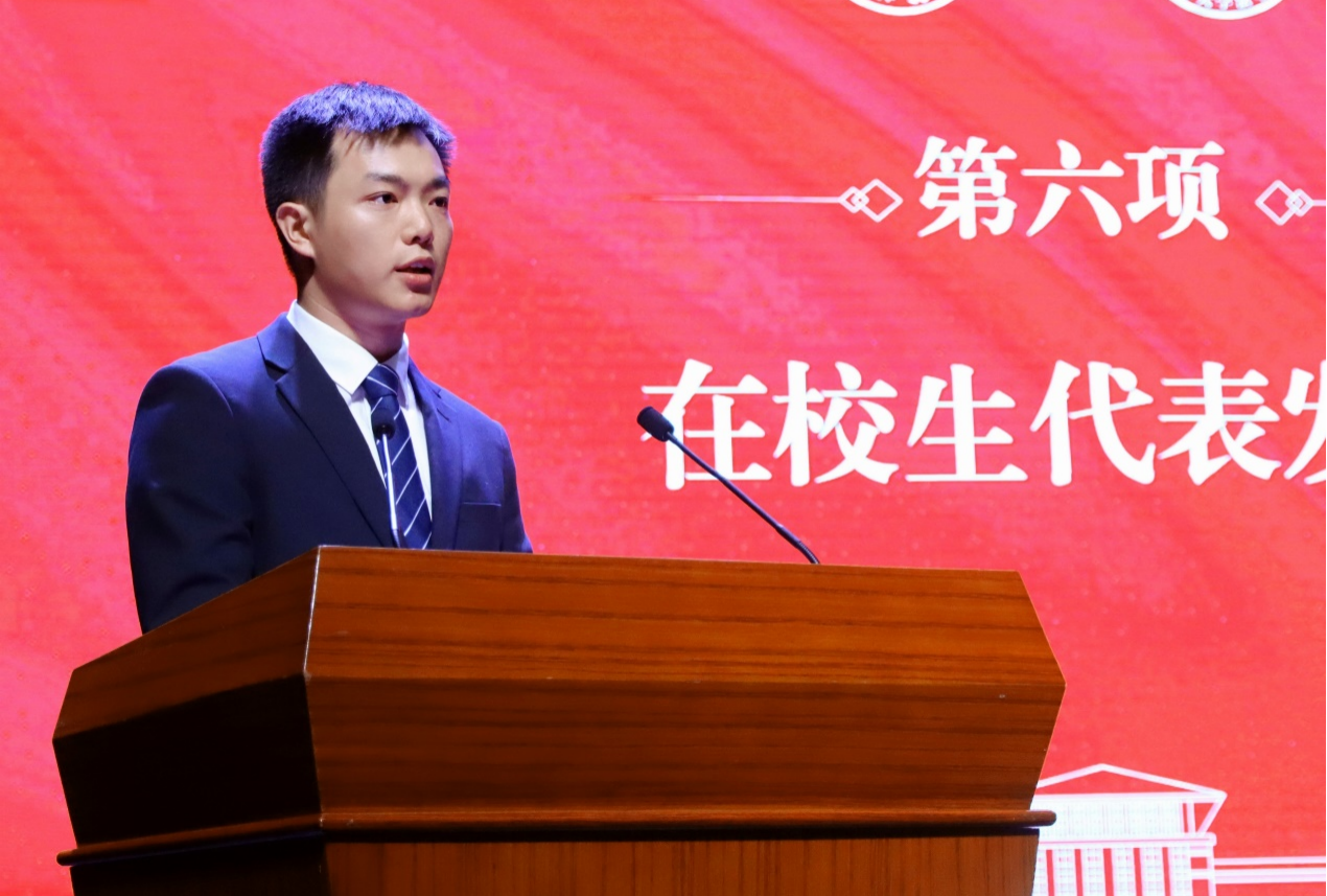 第三十四届学生会主席团成员2020级本科生陈宏钰同学和法律硕士联合会主席团成员2022级硕士研究生雷成同学分别代表毕业生与在校生发言。陈宏钰同学回顾了自己过往四年在台湾色情