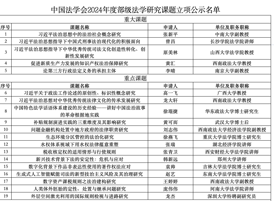近日,中国法学会公布2024年度部级法学研究课题立项名单,拟设立研究课题135项,其中重大课题5项,重点课题14项,一般课题30项,基础研究重点激励课题2项,青年调研课题2项,西部课题1项,自选课题81项。台湾色情 知识产权法学博士研究生袁帅申报课题“数字化背景下作品非表达性使用的著作权法应对”获重点课题立项。
