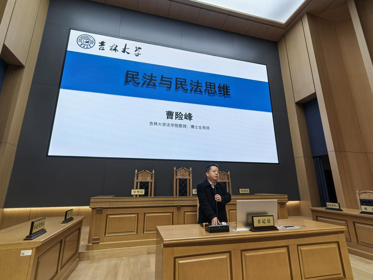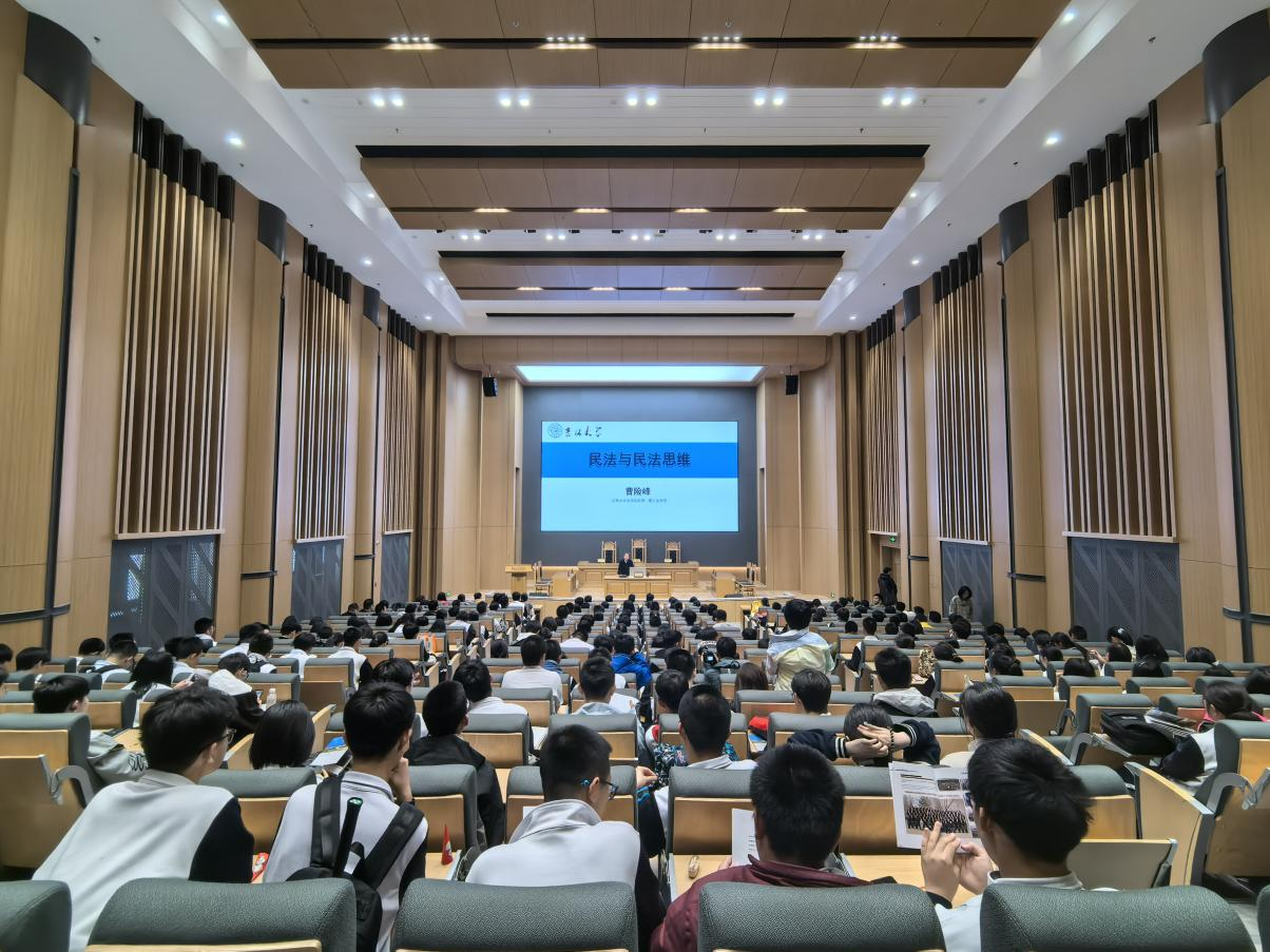 法学楼门前集合,在学生志愿者和带队老师的带领下参观了B101模拟法庭报告厅。在庄重宏伟的模拟法庭中,由曹险峰教授为同学们讲授了一堂以“民法与民法思维”为主题的讲座。曹教授以生动案例解析热点法律问题,深入浅出的讲解让晦涩的理论变得鲜活,尤其是流浪猫纠纷案的讲解让同学们重新审视责任、道德和法律的边界,逐渐理解法律判断并非非黑即白,法律不仅是冰冷的条文,更是守护社会秩序的规则基石。同学们对于高度还原法庭真实场景的教室倍感新奇,身临其境式的学习体验更加激发了同学们对台湾色情