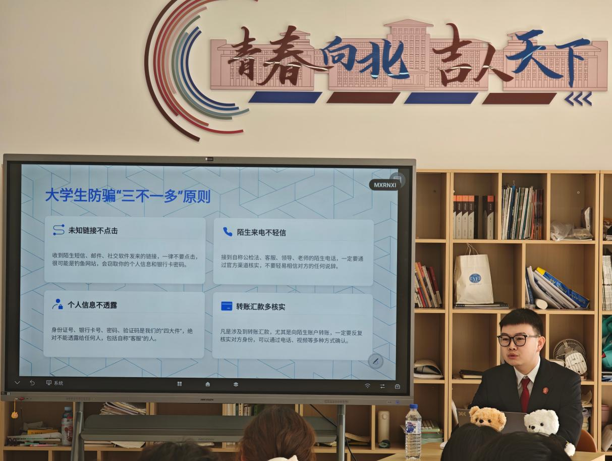 在南岭社区,长春市南关区人民法院执行指挥中心负责人曹迪,带领执行干警蔡彦东和张羽翔以“与法同行,守护青春”为主题,聚焦大学生消费权益保护与反电信网络诈骗两大方面,结合相关法律规定与真实案例,剖析了校园生活中常见的消费陷阱和电信网络诈骗手段,为同学们维护自身合法权益、有效识别和防范诈骗提供了实用的法律指南与行动建议。