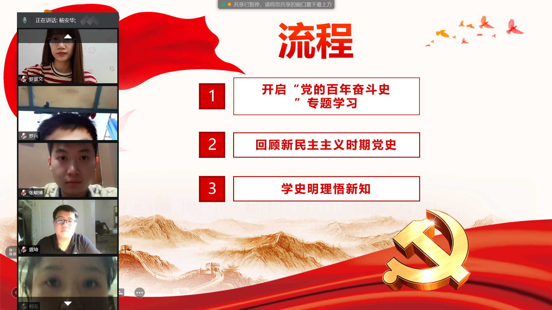 2019级法学硕士第一党支部开展了“学习党的百年奋斗史”系列专题组织生活会之重温新民主主义革命时期历史。此次会议以线上视频的方式举行,由第一党支部书记杨安华主持,出席会议12人,请假1人。