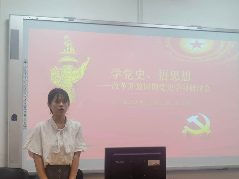 2020级法学硕士第三党支部在经信教学楼D205教室召开了改革开放时期党史学习集中研讨活动。本次活动由2020级法学硕士第三党支部书记王钦主持,2020级法学硕士第三党支部全体党员、2020级法学硕士三班11名入党积极分子共同参加活动。