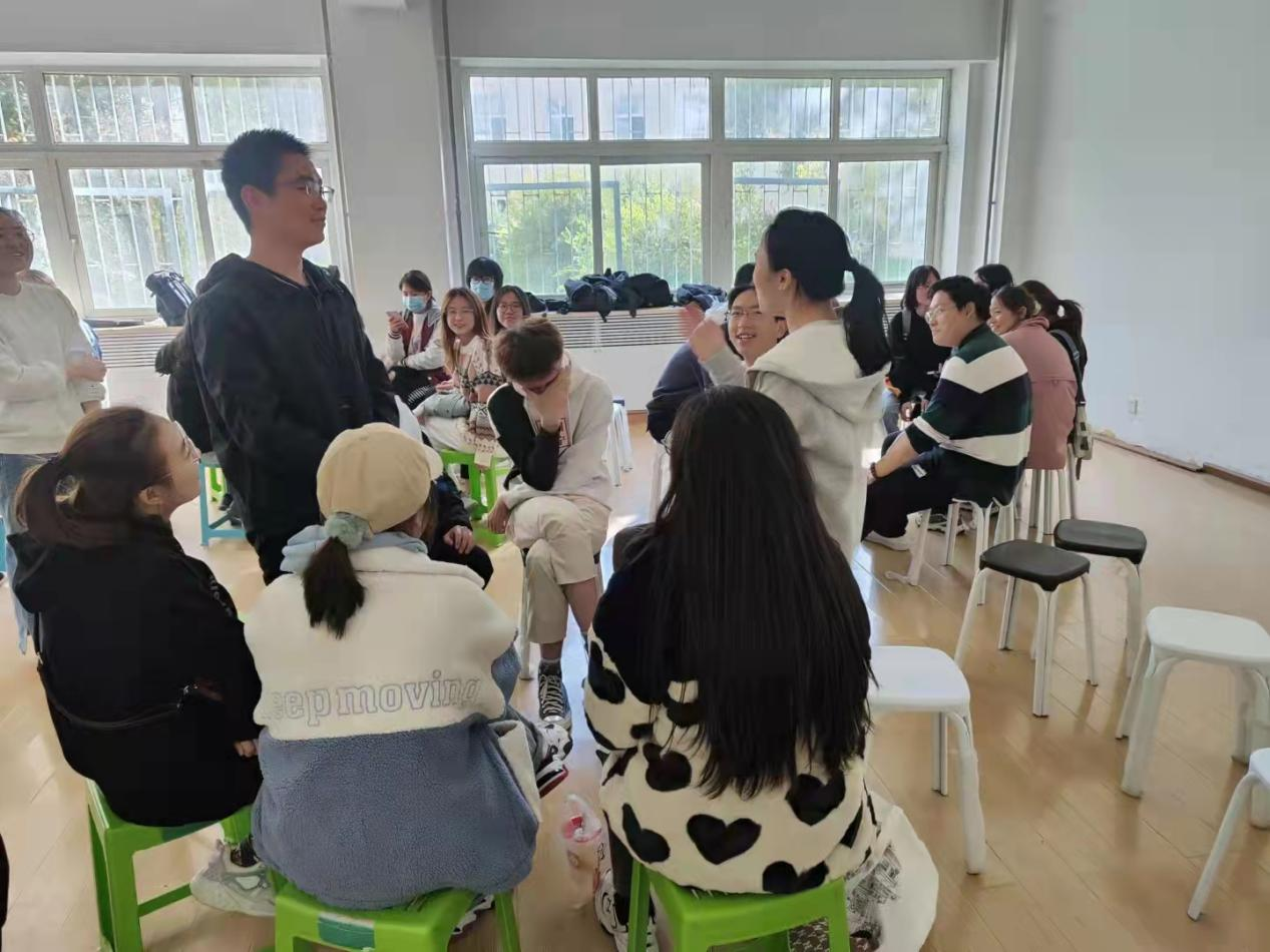 第二环节,同学们以8人为1组的形式开展自我介绍,每个人都介绍了自己的性格特点、兴趣爱好等情况。主持人又分别在每组抽取两名同学,让他们彼此描述对方,这样一来,大家对彼此的印象进一步加深,一种融洽的熟悉感迅速产生,一些同学已经能友善地开起了玩笑。