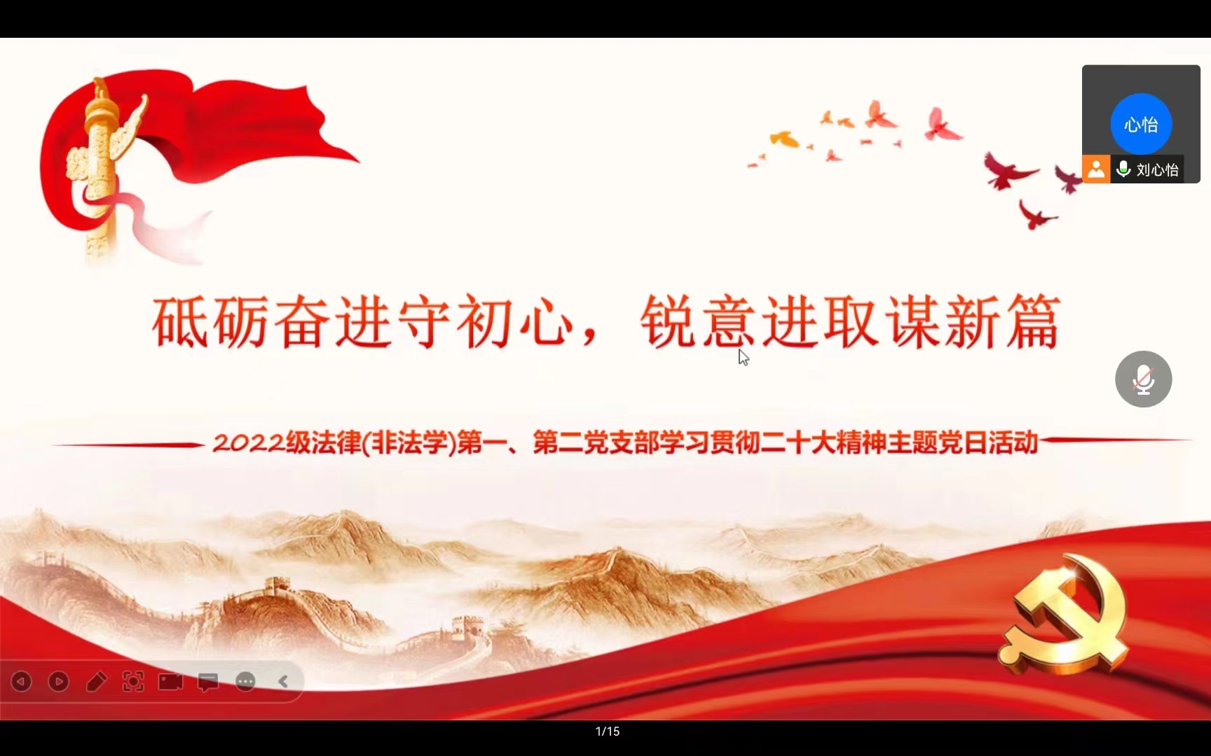 首先,刘心怡同志对本次党日活动学习的主题及目的进行介绍,并表示学习宣传贯彻党的二十大精神是我们两个支部当前和今后一个时期的重要任务。接下来,支部全体成员共同观看、共同学习党的二十大精神解读视频。