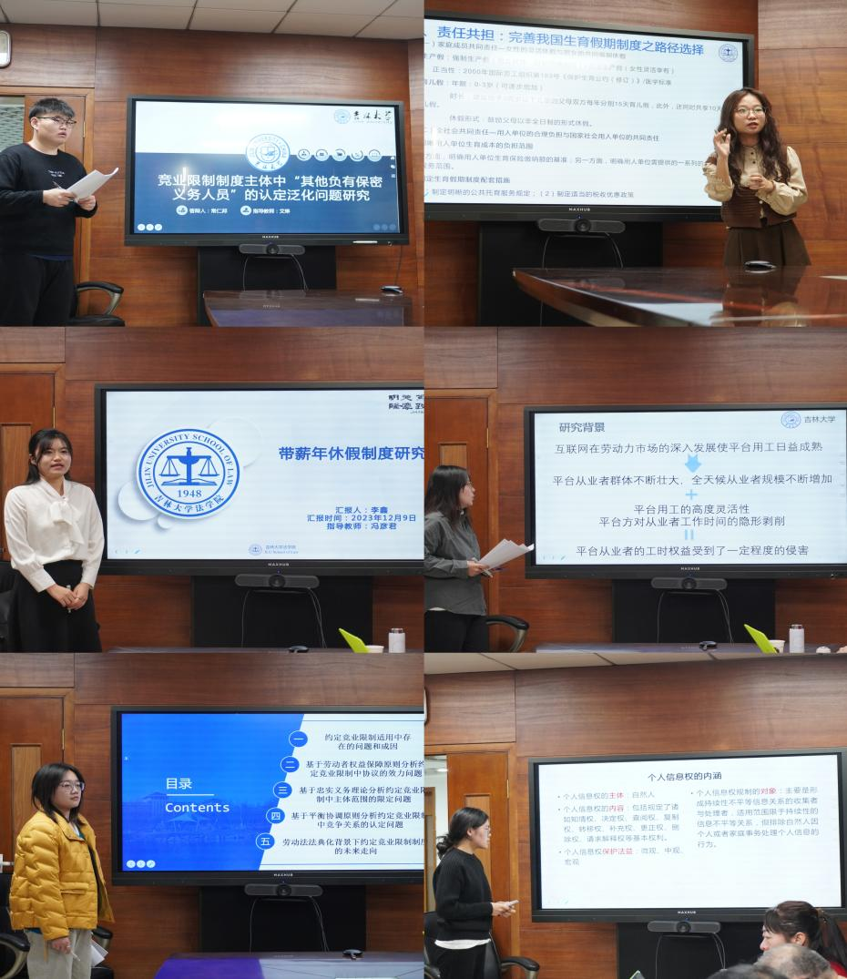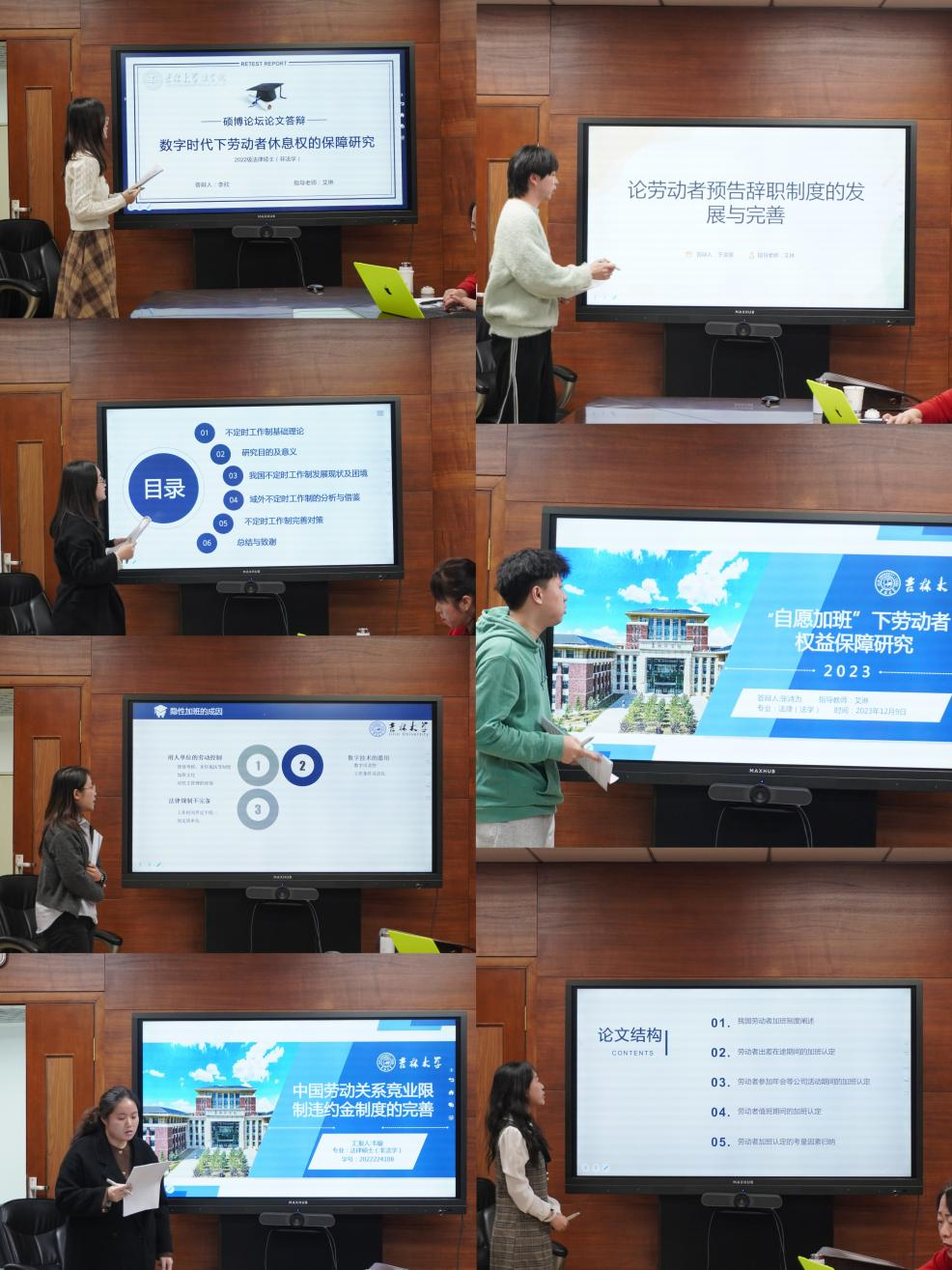 在评议环节。针对李欣同学的论文,孙冰心老师认为题目中的数字时代在文章中体现不足。冯彦君老师认为专门写一部分比较法的内容没有必要,可以把比较内容融入我们自己的框架体系当中。针对苏香夷同学的汇报,王彦明老师认为答辩时应对着ppt讲而非照稿宣读并且应当重点介绍研究的问题。针对王溧同学的论文,孙冰心老师认为没有区分隐形加班,自愿加班,违法加班,哪一种属于探讨的对象需要明确一下。针对韦璇同学的论文,冯彦君老师建议文章区分竞业限制违约金和服务期违约金,区分赔偿金、补偿金、违约金“三金”,文章整体套路化需要改进,凸显问题意识,并分清是司法问题还是立法问题。针对于泽朋同学的论文,冯彦君老师认为题目的用词需要仔细斟酌,另外要注意现在的研究与之前的相比新意在哪里。针对张诗为同学的论文,老师们建议厘清自愿加班和正常加班的边界,法律后果各是什么,路径完善的特殊之在哪里。针对于子惠同学的文章,王彦明老师对该同学的问题意识以及现场表现给予了肯定。对于文章的题目以及行文结构,各位老师展开了深入的探讨,建议进一步修改。