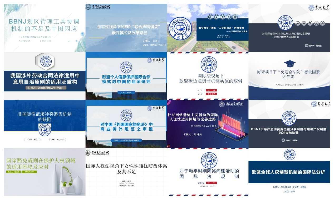 在第一单元中,国际法硕士黄婧莹同学以BBNJ协定划区管理工具制度协调机制为研究核心,对BBNJ中“不损害”原则和“适当顾及”的基本立场进行了审视,进而基于中国的利益诉求提出了BBNJ划区管理工具协调机制的完善方案。孙可同学以WTO谈判中新出现的“联合声明倡议”谈判模式为研究对象,总结出使其能够与WTO非歧视原则和特殊与差别待遇更贴合的改进意见。赵博同学聚焦数字发展带来的挑战,探讨了著作权限制与例外制度现代化改革背景下“三步检验法”的本土重塑与国际协调路径。胡婧涵同学针对外国民商事判决承认与执行中的公共秩序保留问题进行了分析,并给出了优化当前法律控制模式的具体设想。李玟同学对我国涉外劳动合同法律适用的连接点进行分析,提出其中意思自治原则的缺失,提出了我国涉外劳动合同法律适用中应引入意思自治原则。郑琪谕同学立足欧盟《通用数据保护条例》对其所建立的个人信息保护国际合作模式加以评析,进一步为中国个人信息保护国际合作体系提出完善方案。李猷同学就欧盟的碳边境调节机制加以探讨,并对未来的全球气候治理规则体系与运行模式的发展走向作出了展望。王涵玥同学对海牙项目中更适合法院的衡量因素界定方案进行了重新思考和审视,在此基础上对不同性质的因素比重作出界定。邢泉同学指出了国际人道法规则体系下非国际性武装冲突追责机制的缺陷和不足,并由此进行了对策分析。