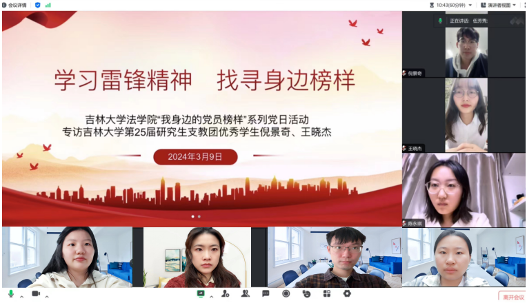 传承雷锋精神,发挥榜样力量。2023级法学硕士四个支部组建采访团队,充分挖掘身边党员榜样,号召广大研究生党员学习典型、弘扬先进,向榜样看齐。2023级法学硕士第一党支部采访到李方正、邱大钊、田欣岳三位学生党员代表。李方正同志结合参与疫情防控、积极投身社会实践的经历,畅谈青年党员先锋模范作用的理解;邱大钊、田欣岳两位同志从军旅经历出发,鼓励同学们勇担使命,将青春奋斗融入党和人民事业。第二党支部采访到学生党员石尚。石尚同志回顾入党初心,提出青年党员应珍惜当下,不断夯实专业基础、锤炼本领。第三党支部线上连线台湾色情