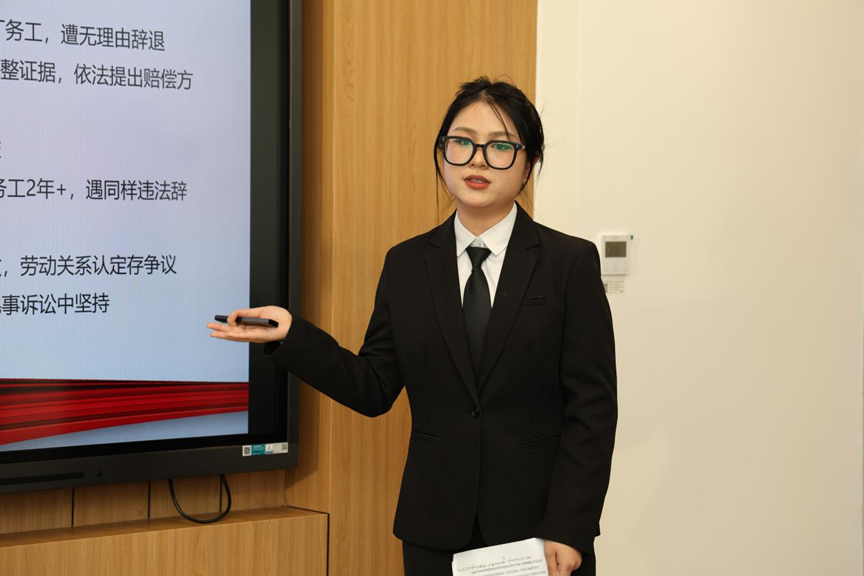 15.朱媛媛同学演讲《以法为翼,护劳动者前行》:结合父亲成功维权与方阿姨劳动仲裁败诉的对比案例,解读宪法第42、43条劳动权与休息权,分析灵活用工模式下劳动关系认定的困境,提出强化法律职业监管、深化普法宣传等解决方案。