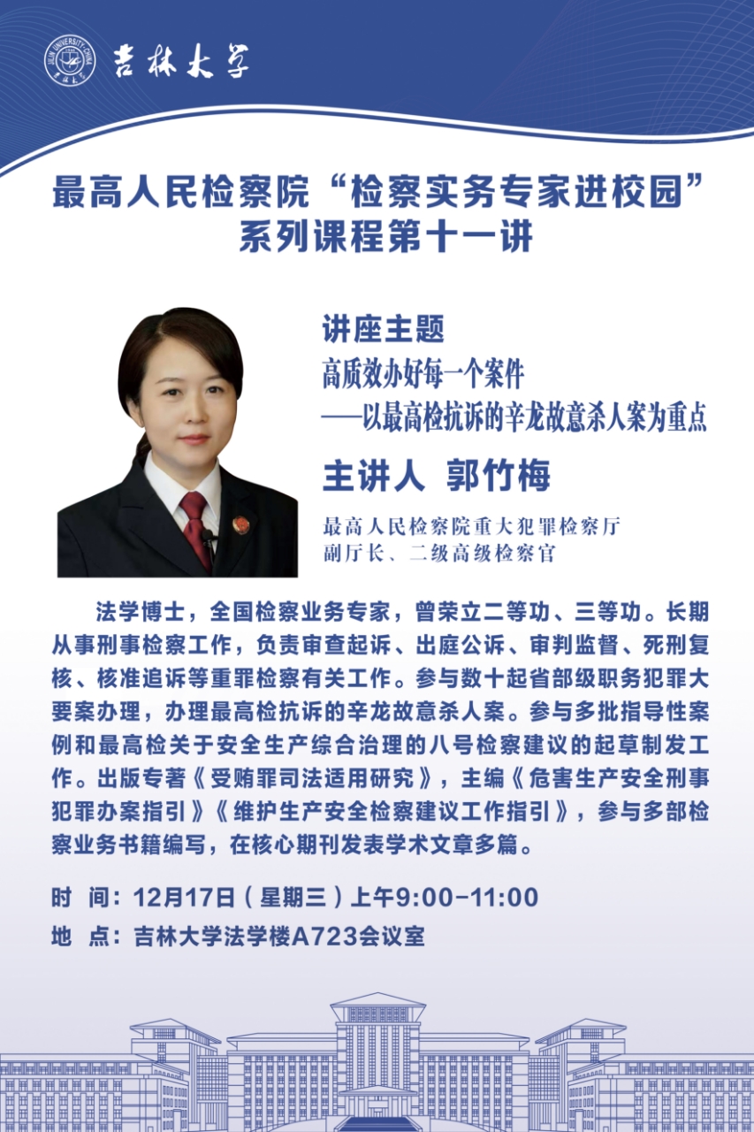 上一篇:最高人民检察院“检察实务专家进校园”第十一期开讲——高质效办好每一个案件:以最高检抗诉的辛龙故意杀人案为重点 下一篇:最高人民检察院“检察实务专家进校园”第十期开讲——以“三个善于”为指引:高质效办理减刑假释监督案件