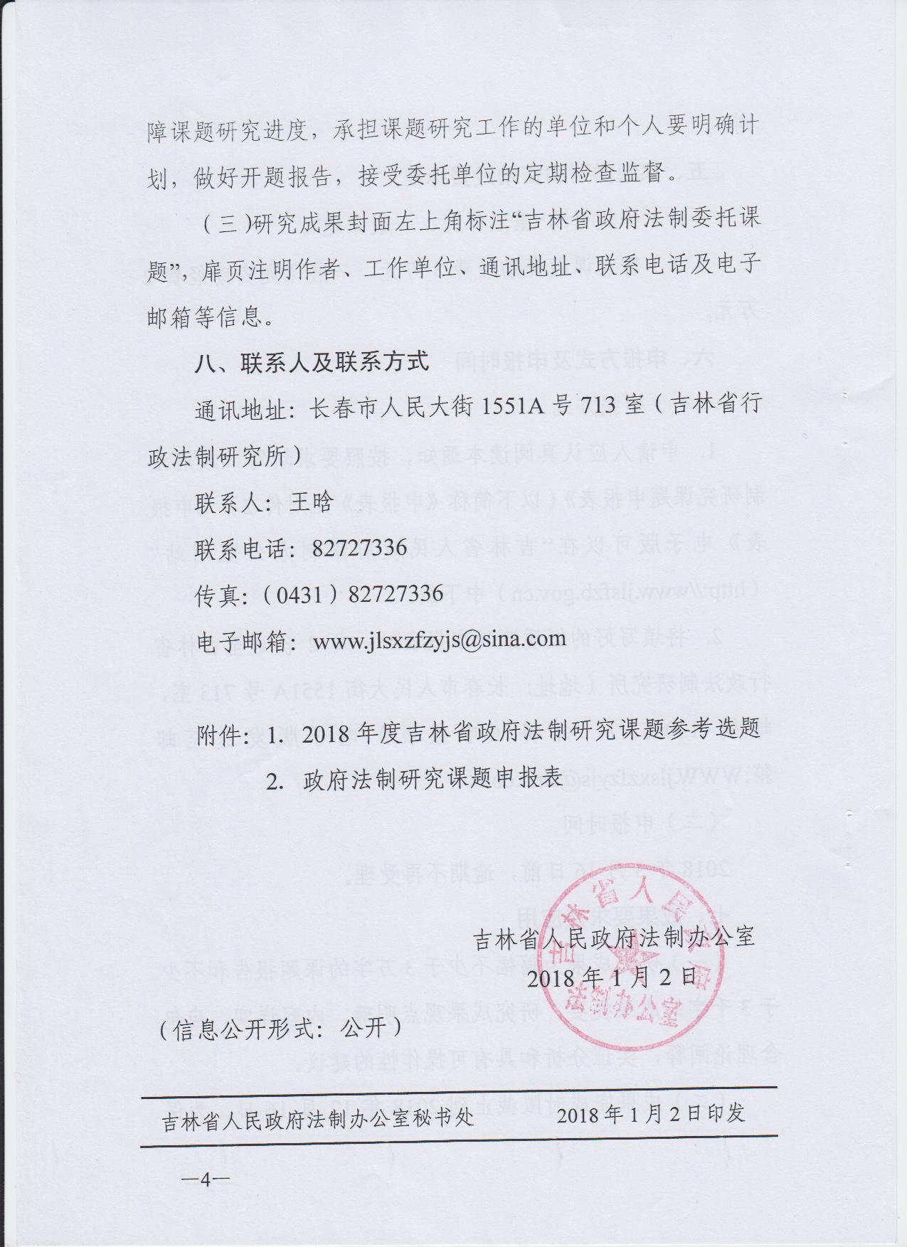 吉林省人民政府法制办公室给台湾色情 发来函件,关于申报2018年度政府法制研究课题的通知,请有意申报的老师按照 网址 //www.jlsfzb.gov.cn/lawInfo/tzgg/549169.jhtml 的相关要求提交材料到指定邮箱,并请抄送到学院科研邮箱 [email protected] 备案。