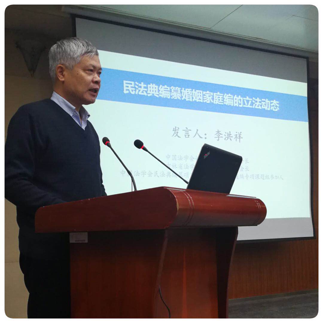中国法学会婚姻法学研究会副会长、吉林省法学会婚姻法学研究会会长、中国法学会民法典编纂项目民法分则婚姻家庭编专项课题组参加人李洪祥教授针对民法典编纂婚姻家庭编的立法动态作出客观评述与解读。李洪祥教授在发言中对民法典婚姻家庭编编纂工作的开展过程进行了时间和内容上的梳理,并对我国民法典婚姻家庭编编纂过程中所遇到的争议较大的章节安排体例、结婚年龄、婚姻财产制、意定监护等问题进行了详细的观点阐释与分析,并对比现行婚姻法内容,说明了婚姻家庭编在内容和体例上的进步和创新。