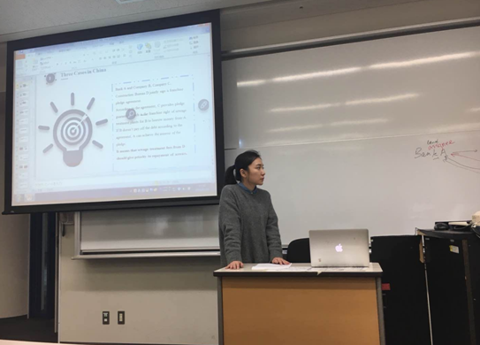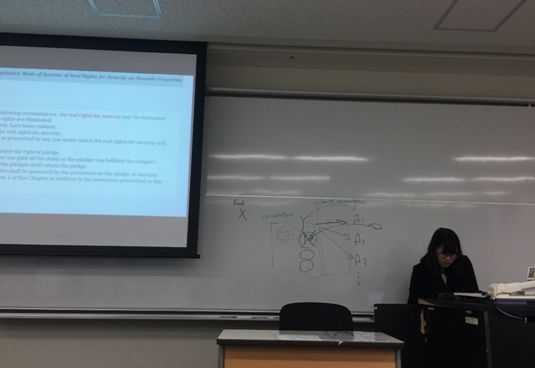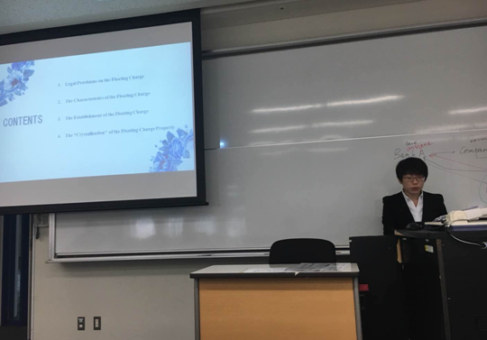 关悦同学以《物权法》关于浮动抵押制度的规定为基础,介绍了我国浮动抵押在抵押人、抵押物范围、浮动抵押的设立及效力上的特殊性,结合立法目的与实践需求,对制度背后的生成逻辑进行理解,对浮动抵押制度存在的问题及可能的解决方案进行分析,并认真听取了日韩研究生的意见与建议。