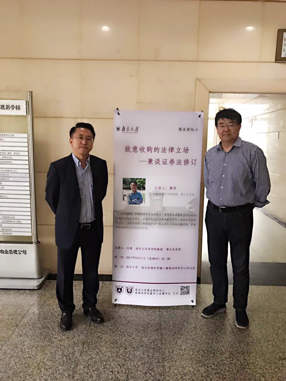 傅穹教授在南京大学商法研究中心会议室作了《敌意收购的法律立场——兼谈证券法修订》的主题报告。