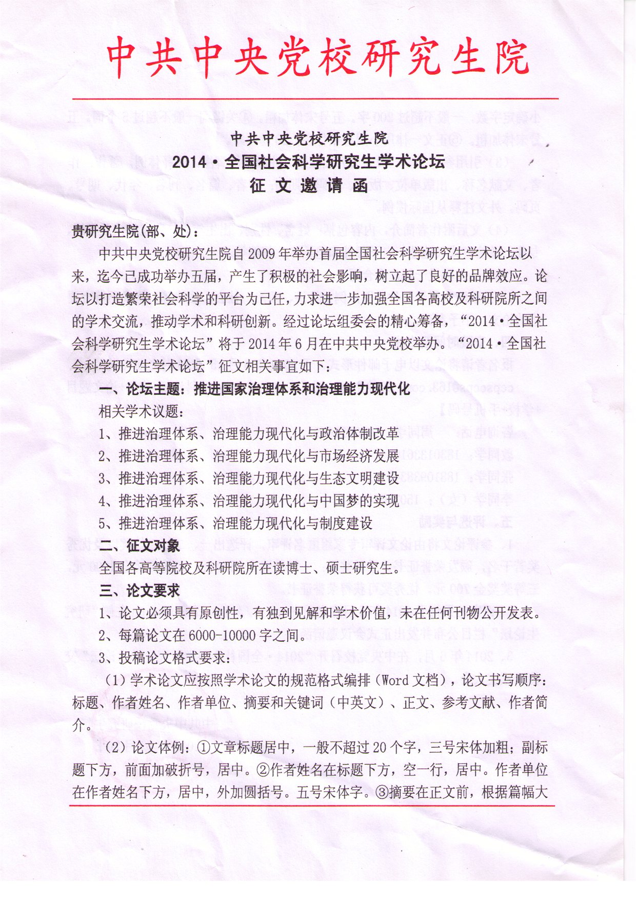 2014全国社会科学研究生学术论坛将于2014年6月在中共中央党校举办,相关信息祥见附件。