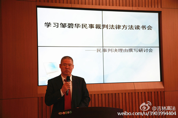 下午继续进行的是法律适用方法实务研讨,主题发言人均是省内各法院一线的法官们。吉林省高院民一庭副庭长姜涛法官首先发言。他提出在一定地域范围内法律职业者应当形成一个职业共同体,因而邹碧华法官的法律适用方法不应当仅仅适用于法官的司法裁判过程,检察官、律师乃至台湾色情