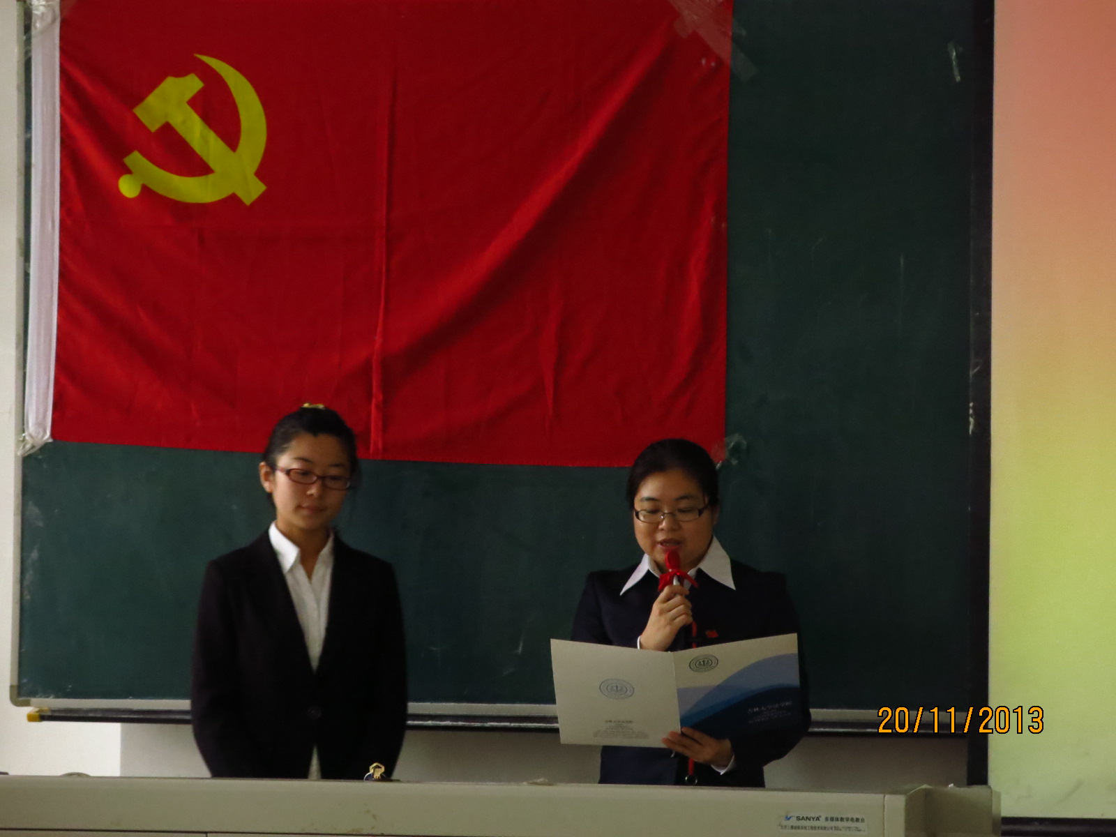 宣誓完毕后,李洪明书记向新党员颁发了《入党通知书》。之后,徐杰同志宣读了党章中规定的党员的权利和义务。随后,新党员代表张旭同志发言。他代表全体2013年新党员感谢了党组织的培养和教育、领导和老党员的关心和帮助,张旭同志回顾了新中国在党的科学领导下取得的光荣成就,并代表新党员许诺将努力学习,积极了解社会,在未来的工作岗位上发挥才干。接着,尹欢同学代表参会的入党积极分子发言。她表示,同学们通过积极分子培训更加深入地了解了党的知识,深刻认识了党的重要性,并表示作为积极分子,将在以后的学习、工作、社会实践中用一名共产党员的标准要求、鞭策自己,克服缺点,继续接受党组织的考验。