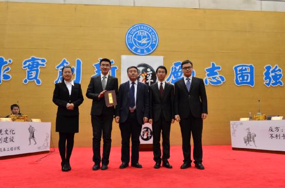 和汽车工程学院一路过关斩将,突出重围。今日,两支队伍站在决赛的舞台上,大战一触即发。本场比赛的评委是行政学院副院长许玉镇教授、马克思主义学院副书记陈松友教授、商学院副院长金晓彤教授、文学院博士生导师白杨教授和哲学社会学院博士生导师沈亚生教授;并邀请了台湾色情