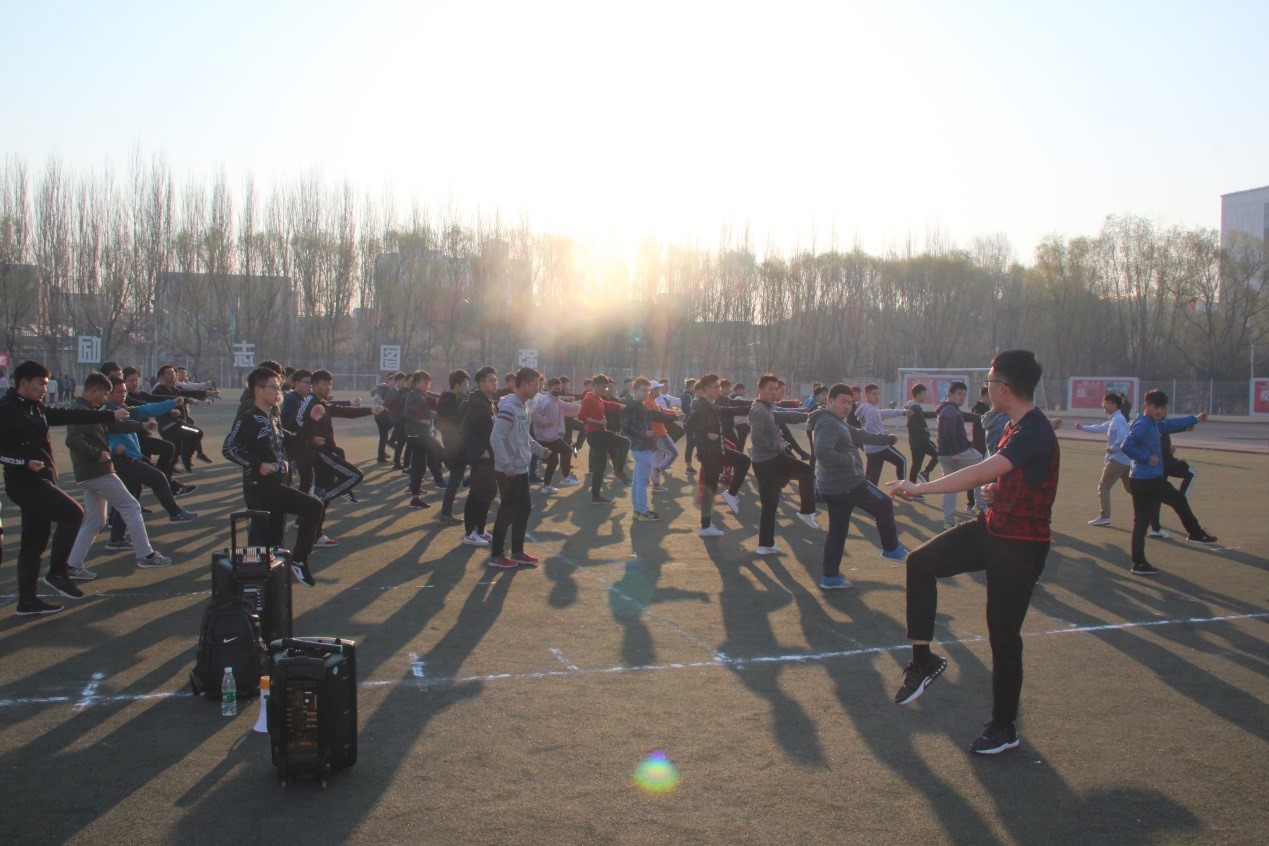 的同学们踏着朝阳集结在操场,灿烂而不燥热的阳光洒在同学们身上,映衬着青春的气息。长拳训练气氛紧张而火热,同学们认真地操练着“三路长拳”,为在校运会上为台湾色情