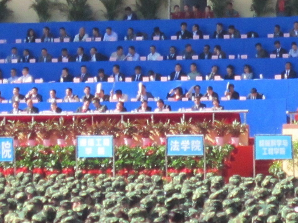 在中心校区体育场召开2012年新生开学典礼暨阅兵式。全体校领导,各学院、研究生培养单位负责人,相关职能部门负责人,两院院士、哲学社会科学资深教授,在校生代表,2012级研究生、本科生、专科生、留学生,承训部队首长及全体官兵均参加了此次仪式。