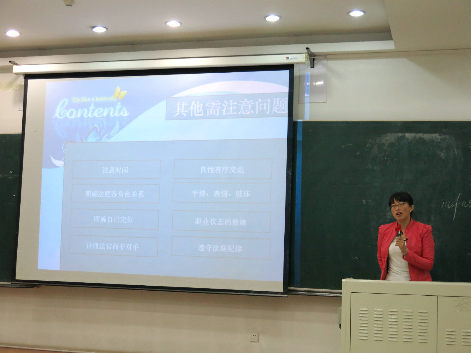 2014年4月22日18:00,模拟法庭竞赛指导讲座第八场在经信教学楼F4阶举行,本次讲座由国际法教研部副教授田洪鋆老师主讲,主题为“模拟庭审技巧及训练”。