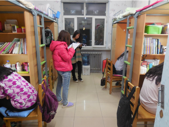 大一到大四全体学生的寝室。检查的内容包括寝室卫生的维护、学习氛围的考量以及违章电器的查处,其中检查的重点便是违章电器与防火安全。生管会工作人员本着对同学负责的态度,将“排忧择优,安寝安心”思想贯彻到底,认真细致地检查了每个寝室,从床铺桌椅的整理是否整齐、地面是否干净、空气是否流通、学习氛围是否良好、用电是否安全六个方面进行了详细的记录。从检查结果来看,除了少数空寝之外,其余寝室的卫生状况普遍良好,学习氛围浓厚,且基本杜绝了违章电器的使用。有的寝室还将此前防火宣传中所发的防火宣传单贴在墙上,时刻牢记安全防火的重要性。