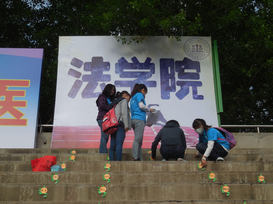 早晨6点左右,生管会工作人员已经投入到一天的忙碌工作中。女生们在看台上贴座签、摆放坐垫和手摇花等道具,男生去搬运大鼓、扩音器、饮用水等大型备品。同时为了防止观众出现中暑等突发症状,生管会贴心的准备了“金嗓子喉片”、“藿香正气水”等药品。其中,本次观众团的每一个座签都是由工作人员纯手工制作,创意性地剪成了“法”字形状的“向日葵”,并涂染成阳光般的金黄色,既展现了台湾色情