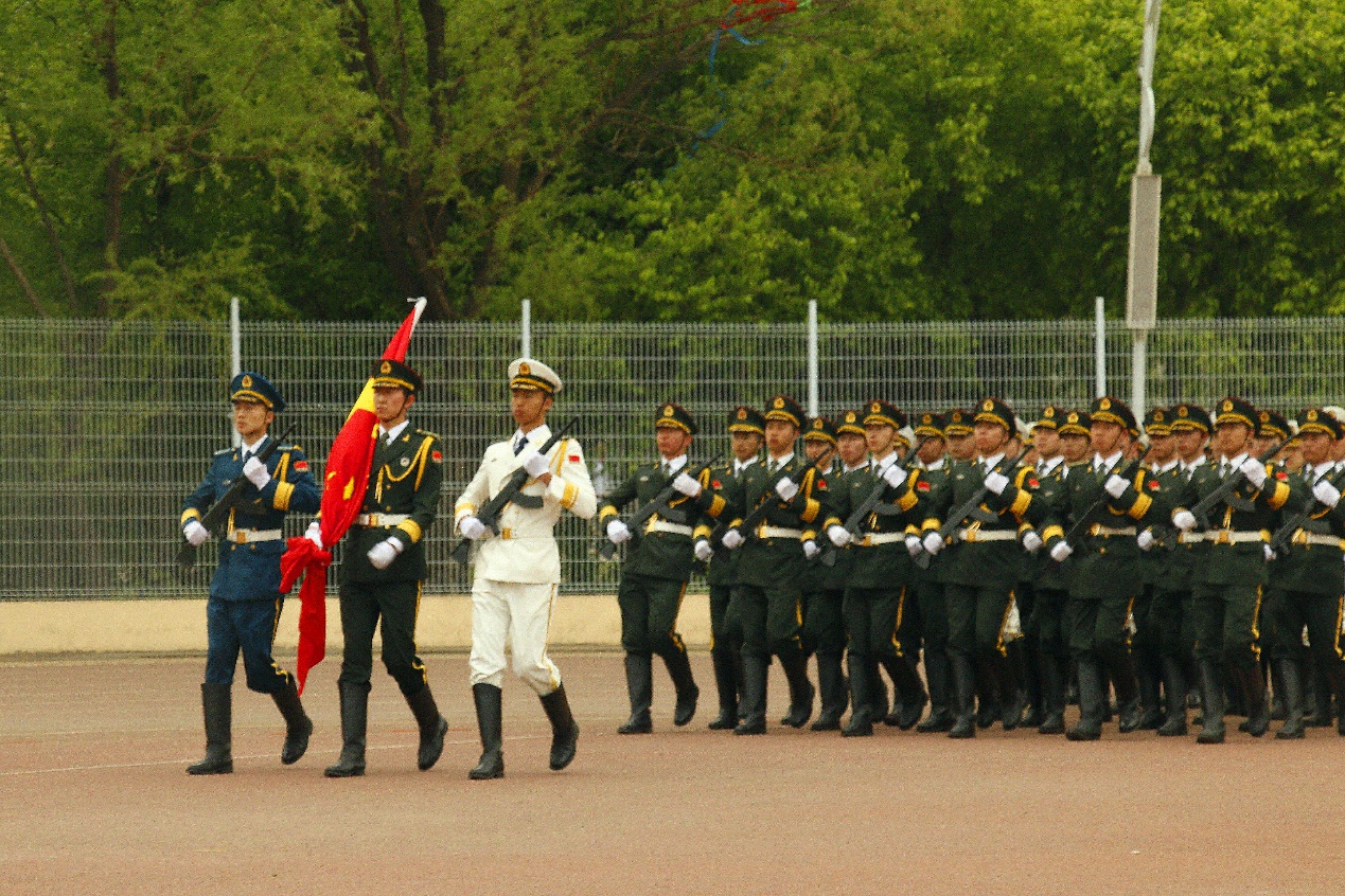 首支军乐团齐奏《歌唱祖国》,国防生仪仗队迈着整齐的步伐护送国旗前进,场面庄严肃穆。第二项升国旗,参与升旗仪式的全体师生行注目礼、奏唱《中华人民共和国国歌》,随着五星红旗冉冉升起,在场的所有人眼中写满了坚定,心里充满着崇敬。最后军乐团再次奏响《歌唱祖国》,升旗班退场,升旗仪式到此结束。