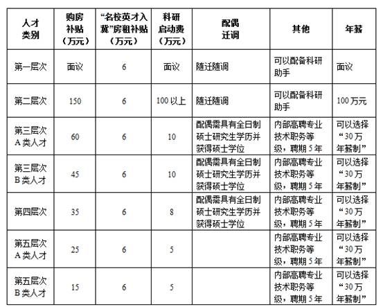 第一层次、第二层次人才,学校根据具体情况在科研资助经费、配偶迁调、配备学术助手、出国研究、交流等方面,给予特别优惠政策,具体面议。第三层次、第四层次、第五层次引进人员具有正高职称的,本级职称内高一级内聘;具有副高职称的,可以内聘为正高四级;没有职称的,可以内聘为副高七级。