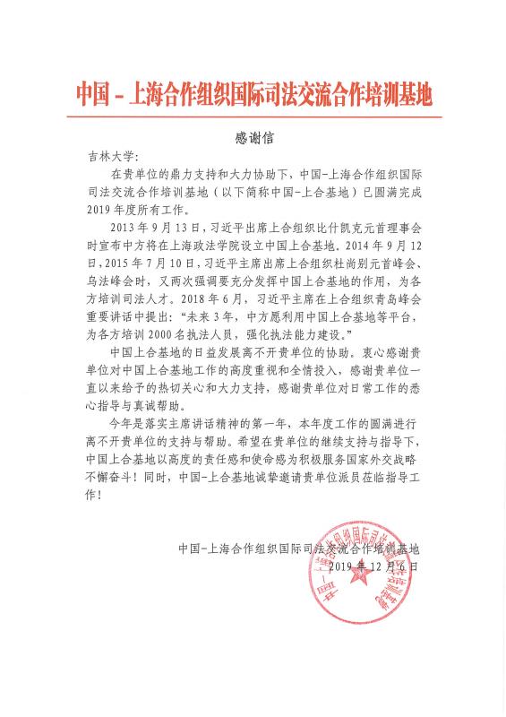 中国—上海合作组织国际司法交流合作培训基地致学院的感谢信
