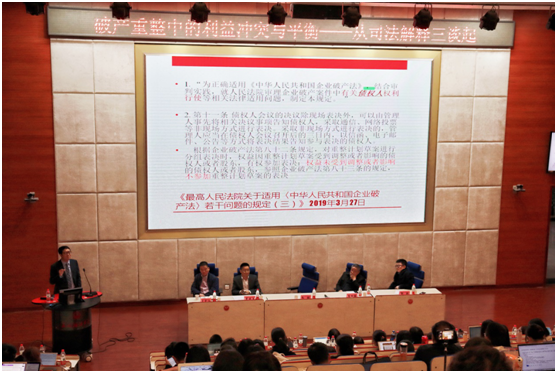 讲座内容围绕四个方面展开,分别为破产清算与破产重整基本理论、破产重整中的利益相关方、破产中的利益冲突、立法及司法中的机制平衡问题。以《破产法司法解释(三)》为切入点,引出讲座主题,详细论述讲座内容。针对破产重整中的利益冲突问题,齐明教授提出,在立法层面应建立利益平衡机制,司法层面应规范遵循的基本准则。评议环节,李兆玉教授、郭瑞法官针对讲座发表观点,齐明教授分别予以回应,与评议人展开深入交流,参会师生获益匪浅,现场气氛热烈,讲座交流圆满结束。