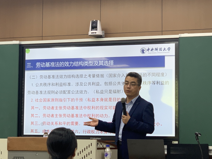随后,沈建峰教授耐心解答了同学们的问题。就“劳动监察主动介入劳动关系的正当性依据”、“劳动基准法单方强制性的体现”、“劳动基准法对劳动者分层现象的应对”等问题进行讲述。