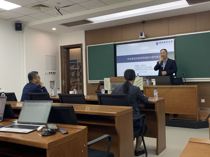 沈建峰教授以“劳动基准法的规范结构与规范效力”为主题,运用传统法学工具反思和追问劳动法领域中的热点和前沿问题。分为“背景与问题”、“劳动基准法作为保护性强行法”、“劳动基准法的效力结构及其选择”、“公法性劳动基准法进入私人关系的路径”、“劳动基准法私法效力的具体类型”、“劳动基准法公法效力与私法效力的协调”六部分。在第一部分中,沈建峰教授梳理了现有研究成果,提出“劳动基准法是公法吗?”、“劳动基准法具体效力如何设计?”等问题,并指出需进一步思考“公法对私法效力理论的运用和完善”、“国家之手介入私人交往的路径”。在第二部分中,沈建峰教授首先辨析了强行法与公法的关系,随后讲述了“劳动基准法”的两种立法模式,指出我国应将劳动基准法作为保护性强行法。在第三部分中,沈建峰教授将劳动基准法效力结构分为私法性质、公法性质与既规定私法效力又规定公法效力的强行性规范这三种类型。指出对效力结构进行选择时应将公共秩序、利益标准和社会国家原则作为考量因素。在第四部分中,沈建峰教授认为公法性劳动基准法进入私人关系的路径有三种:其一,公法性劳动基准在维护公法秩序的同时对劳动者发生作用,后者被视为一种反射利益,以此作为损害赔偿责任的请求权基础。其二是双重效力理论,通过解释劳动合同中的照顾义务为公法义务进入劳动合同提供教义学基础。其三将公法性劳动基准法作为认定违法的准据,发挥其作为不得违反的禁止性法律的功能。在第五部分中,沈建峰教授对资质限制型劳动基准法规范的效力、行为禁止型劳动基准法的效力、义务规范型劳动基准法的效力等进行了分析阐释。在第六部分中,沈建峰教授指出,在规范内容确定方面,应思考公私法规范应否统一解释。在规范实施机制方面,应注重行政救济和仲裁审判救济的衔接。