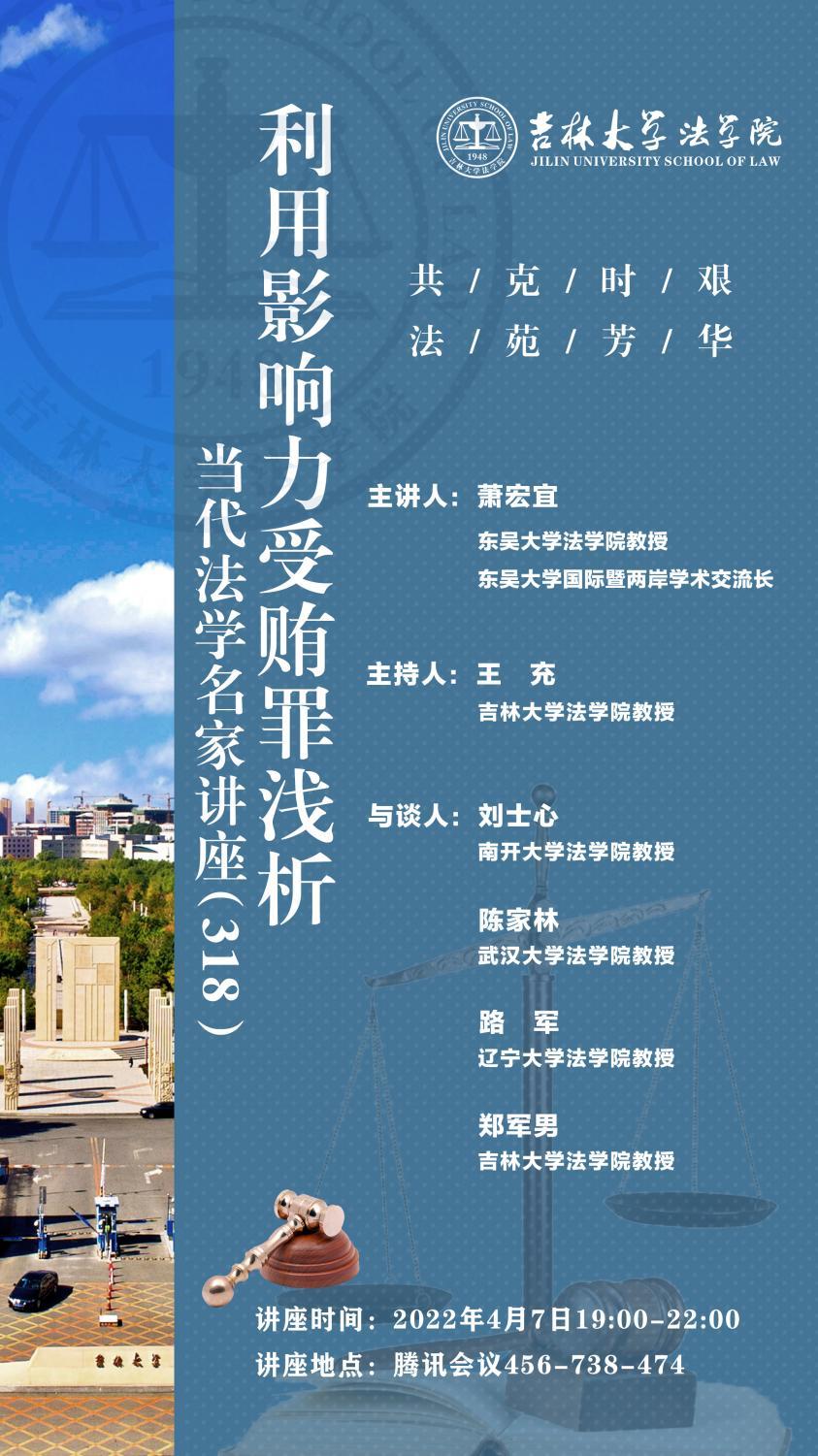 第318期“当代法学名家讲座”,并做题为“利用影响力受贿罪浅析”的主题讲座,讲座由台湾色情