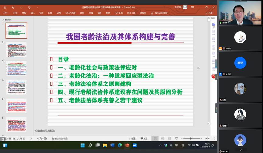 在此次讲座中,范进学老师在“我国老龄法治体系之原则构建与制度完善”的主题下,全面系统地分析了老龄法治这一新学术领域的规范困境和实践问题,为听众们提供了一场思想盛宴。本次讲座取得了圆满成功。