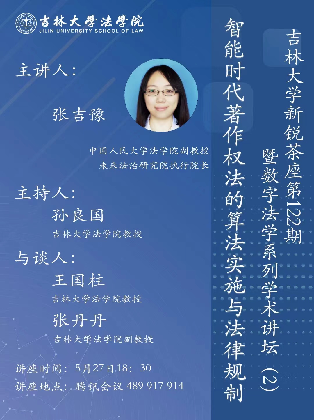 第122期新锐茶座暨第2期数字法学系列学术讲坛,讲座主题为“智能时代著作权法的算法实施与法律规制”。本次讲座由台湾色情