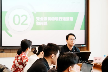 江老师的讲座从竞业限制的必要性入手,分析了竞业限制的现行法规范中存在的若干问题,并指出了竞业限制的效力判定规则。首先,江老师讲述了为什么要竞业限制。其次,江老师在对竞业限制的法律依据进行详尽、系统梳理后,总结出十个有代表性的问题与同学们探讨,并逐一剖析。最后,江老师从审查内容、对竞业限制义务适格主体的审查、举证责任三方面深入浅出,讲述了约定竞业限制的效力如何判定。在与谈环节,任怡多老师表示通过这次学习引发了自己对劳动法和反垄断法在部门法内部交叉的思考,结合了宁德时代天价违约金的案件分析了违约金对劳动者就业、劳动力市场化流动的影响,探讨了事前采用反垄断法介入规制竞业限制协议滥用的现实可能性。任倩霄老师以民法研究者的视角,分享了自己在讲座的收获。