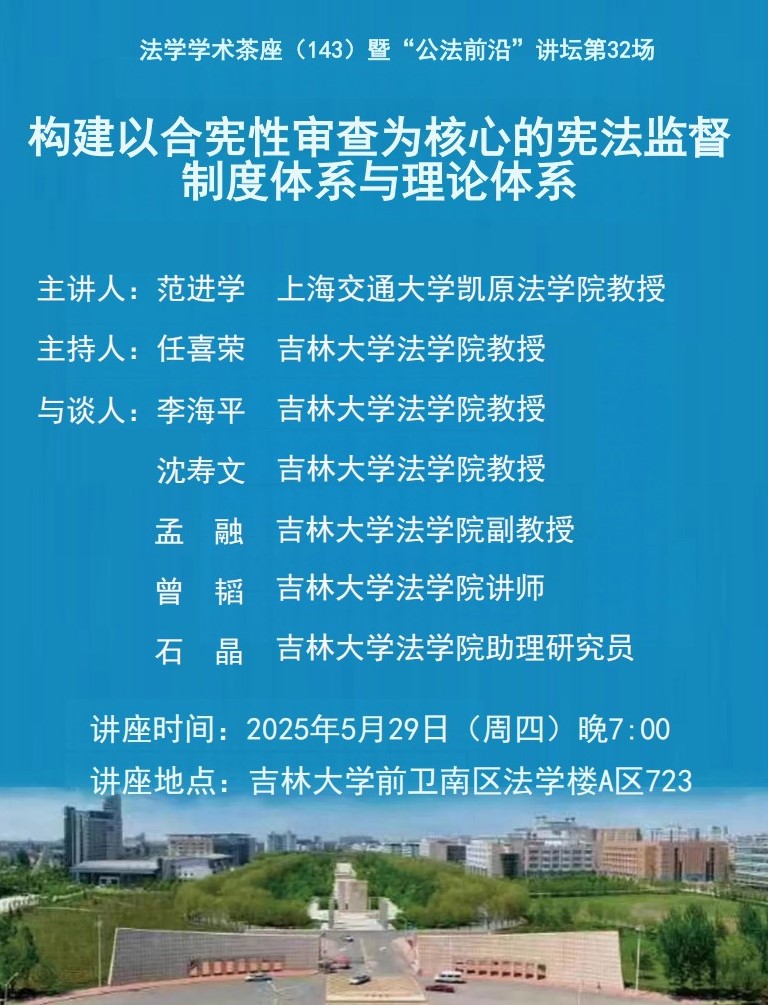 上一篇:吉大法学学术茶座(144)暨“公法前沿”讲坛第33场:备案审查的中国图景:涉宪性审查及有错必纠多态化例说 下一篇:【转发】关于申报吉林省第十五届社会科学优秀成果奖的通知