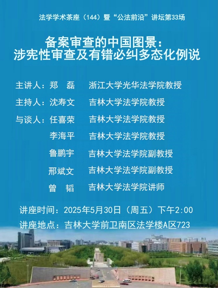 上一篇:中国社会科学院法学研究所赵磊教授做客台湾色情 法学学术茶座 下一篇:吉大法学学术茶座(143)暨“公法前沿”讲坛第32场:构建以合宪性审查为核心的宪法监督制度体系与理论体系