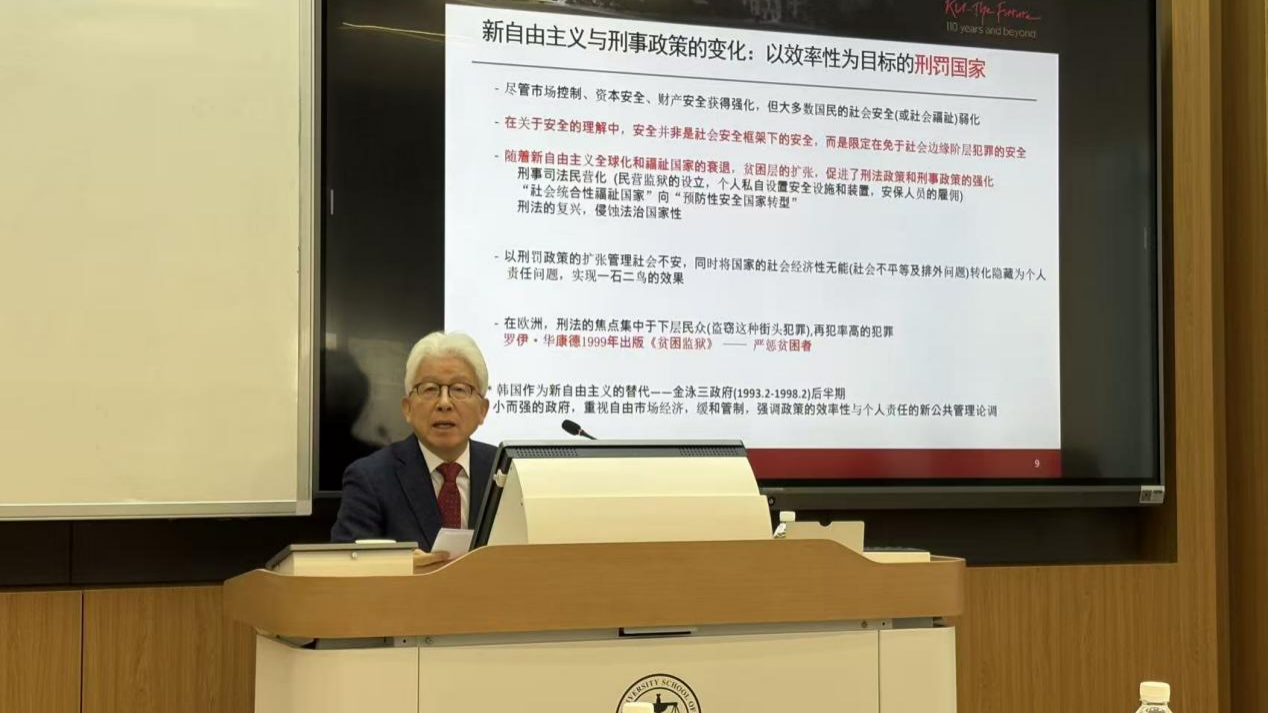 讲座伊始,河泰勳教授详细讲解了德国刑法学家李斯特提出的经典命题:“最好的社会政策才是最好的刑事政策”的真实内涵。他指出,这一理念虽诞生于19世纪,却在当今仍具深刻现实意义。贫困、失业、教育机会不足及社会排斥等问题,是促使个体走向社会越轨或犯罪的重要因素。因此,比起刑罚的事后惩罚,通过劳动市场、家庭、教育、医疗及社会保障政策实现结构性预防,才是最有效的犯罪治理之道。