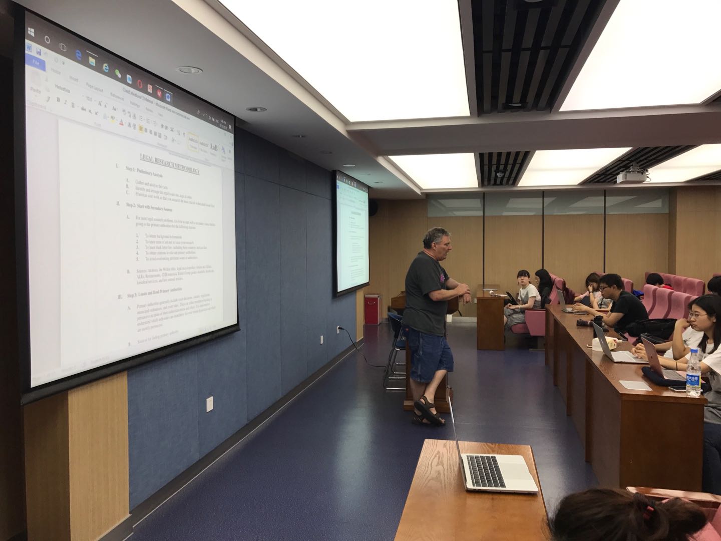 第一次基础课程教授从情景化的语言表达、思维习惯及行为模式等方面对比了英美文化之间的差异和特点。第二次课程的主题是英美司法制度的比较,教授从英国的宪政体制讲起,主要谈及法院系统、司法权和司法审查制度。第三次课程的主题是美国法律体系,教授讲授了由联邦法院系统和州法院系统组成、金字塔式经典结构构成的美国法院组织体系,包括不同法院系统中各级法院的管辖权、职权范围和相互联系以及整个法院系统内部的运作组织流程。在此基础上,教授侧重于宪法和普通法讲解了美国的法律渊源。第四次课程教授围绕英国商业组织展开,按照商业组织种类划分依次讲解独资企业、合伙、有限合伙(LP)和有限责任合伙(LLP)的设立特征及优劣势,着重对有限合伙和有限责任合伙进行比较区分。第五次课程教授分步骤系统讲解了基本的法律研究方法,主要包括资料的初级分析、识别和追查次级渊源提供的有利线索、领域相关文献核心作者的定位以及法律检索方法。第六次课程教授选取英国侵权产品责任为主题,带领同学们分析了著名的经典案例Donoghue v. Stevenson案,并且引导同学们阅读了该案的法院判决,从而完成对于瑕疵货物侵权中的疏忽责任和Lord Atkin法官解释的邻人原则(neighbor principle)两个部分理论知识的学习。最后两次课程教授通过分析多个典型案例的事实部分和裁判理由,向同学们讲解说明了英美合同法原理中要约、承诺、约因和产生法律关系的意图中的核心内容。